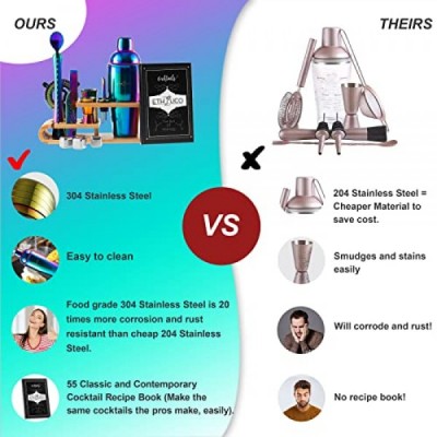 ETHYLICO 칵테일 셰이커 키트 | Barware 도구 세트 | 천연 대나무 스탠드가 포함된 전문가용 15피스 바텐더 키트 - 55가지 칵테일 레시피 북 포함 - 레인보우