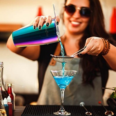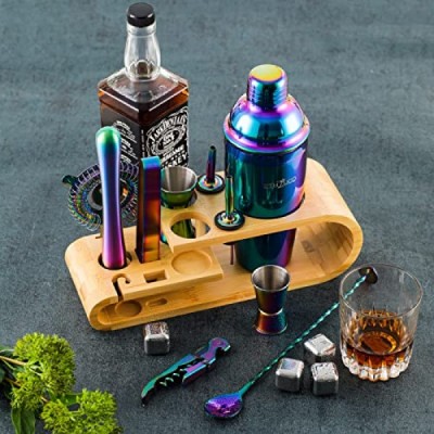 ETHYLICO Cocktail Shaker Kit | Barware Tool Set | Professional 15 Piece Bartender Kit with Natural Bamboo Stand - 55 Cocktail Recipe Book Included - Rainbow