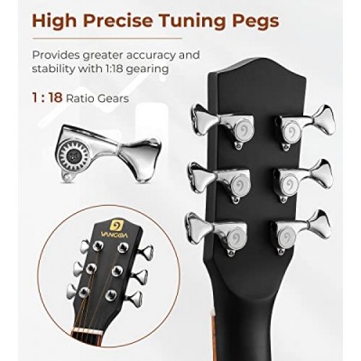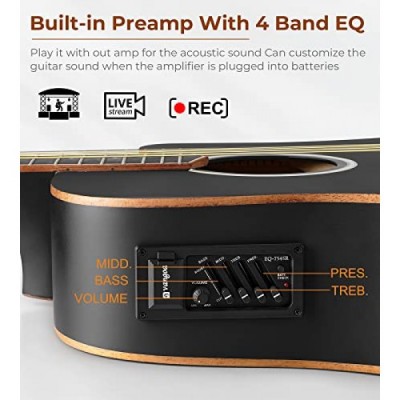 초보자를 위한 Vangoa 일렉트릭 어쿠스틱 기타 키트 성인용 풀 사이즈 장면 전환 어쿠스틱 기타 번들 세트(픽업 내장 포함) 백 튜너 스트랩 카포 픽 케이블, 매트 블랙