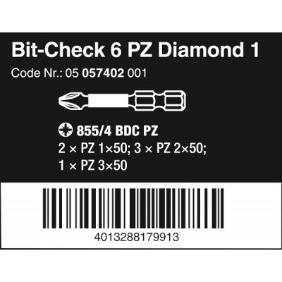 Wera Bit-Check 6 PZ Diamond 1 Anti Cam-out BiTorsion Long Life bit set for drill/drivers, 50mm PZ 6 piece, 05057402001